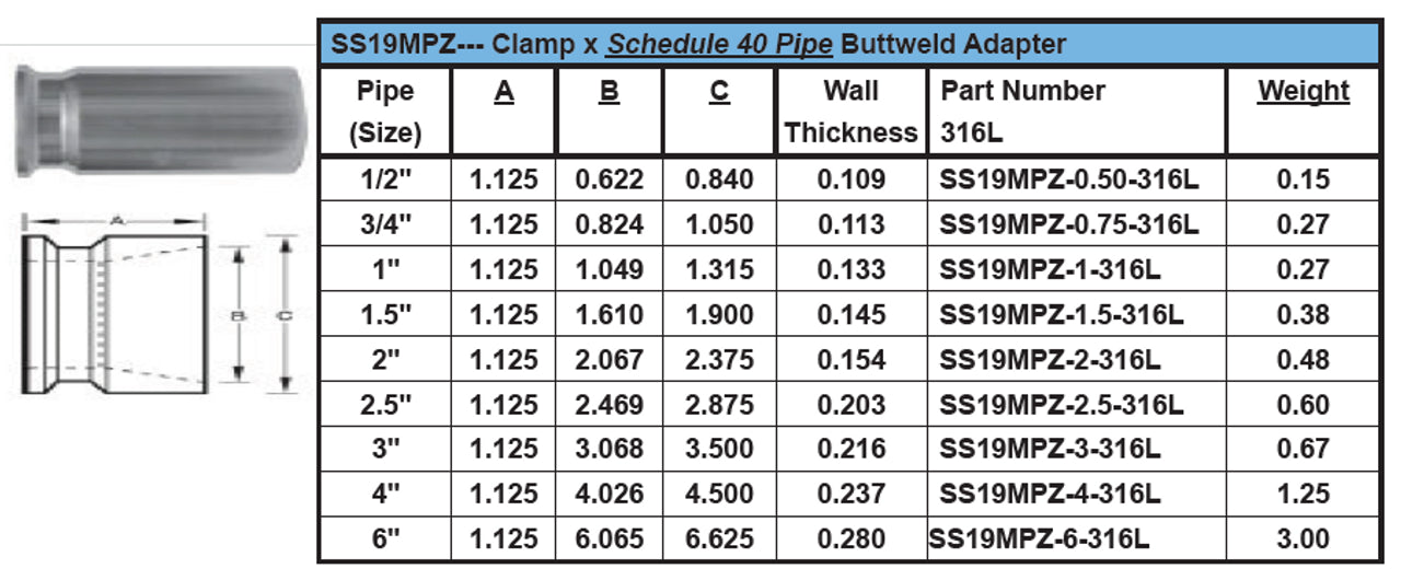 Sanitary Clamp x Schedule 40 Pipe Weld Adapter